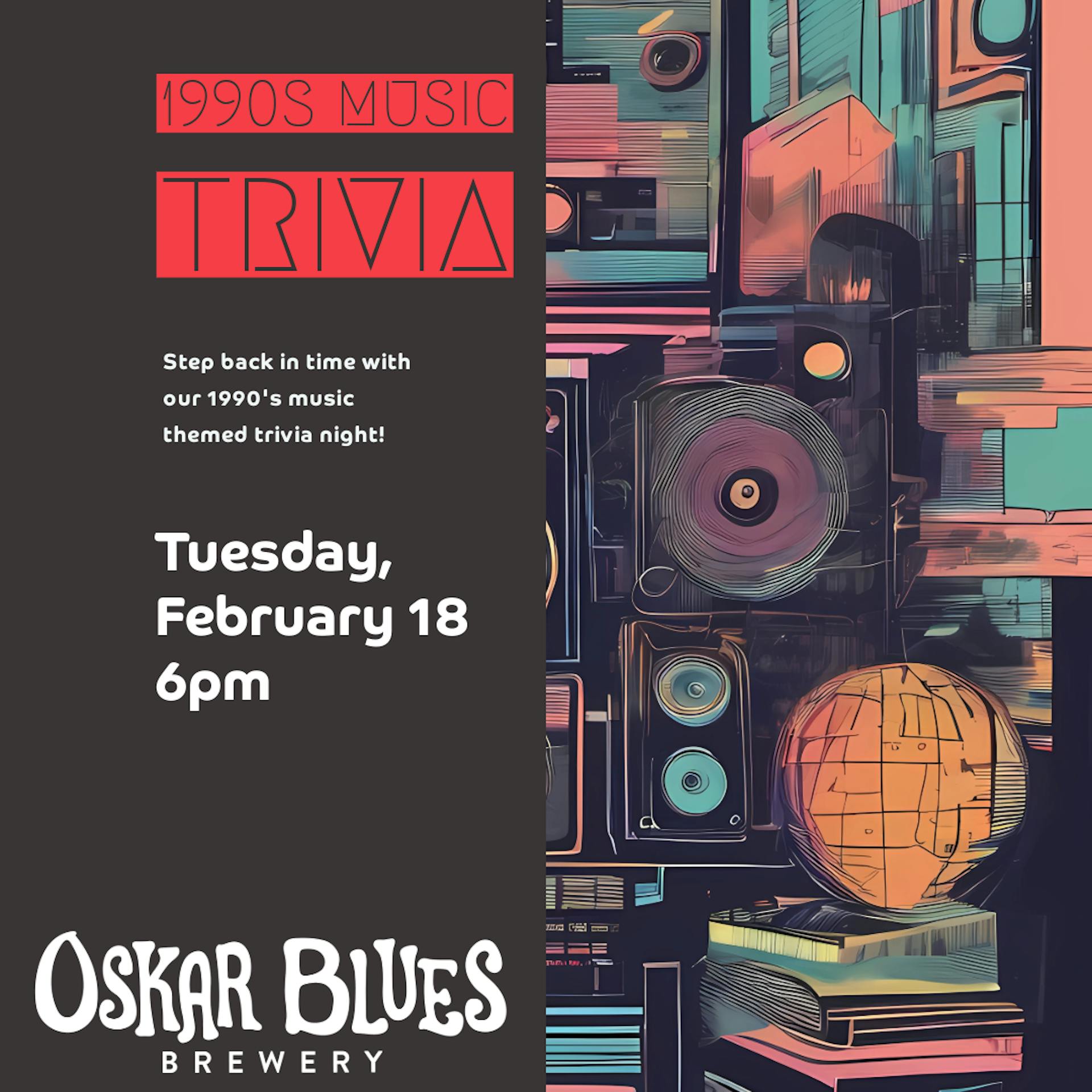 90’s Music Trivia Night at Oskar Blues on Tuesday, February 18 at 6pm. Get your band together, it’s time to rock ‘n’ roll! ![]()